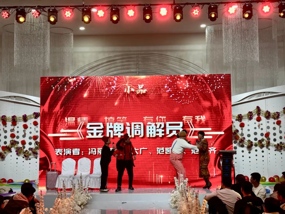 薈萃星光,觥籌熠熠,隨著頒獎(jiǎng)典禮的結(jié)束,晚會(huì)在瀟灑的開場舞《驍》中正式拉開帷幕,隨后,公司各部門工作人員為大家?guī)砹宋乃囇莩?,歌曲演唱《笨小孩》、《海芋戀》、《著魔》,黑管?dú)奏《上海灘》,舞蹈表演《科目三》、《桃花朵朵開》,小品節(jié)目《四大才子招親》、《金牌調(diào)解員》,大合唱《壯志在我胸》,一段段精彩紛呈的節(jié)目收獲了臺(tái)下觀眾源源不斷的掌聲與歡呼聲,展現(xiàn)了泰威人蓬勃向上的青春風(fēng)采。其中,小品《金牌調(diào)解員》的演員們,憑借著精湛、搞笑的演技,得到了全場觀眾們的認(rèn)可,小品被評(píng)為全場最佳節(jié)目。